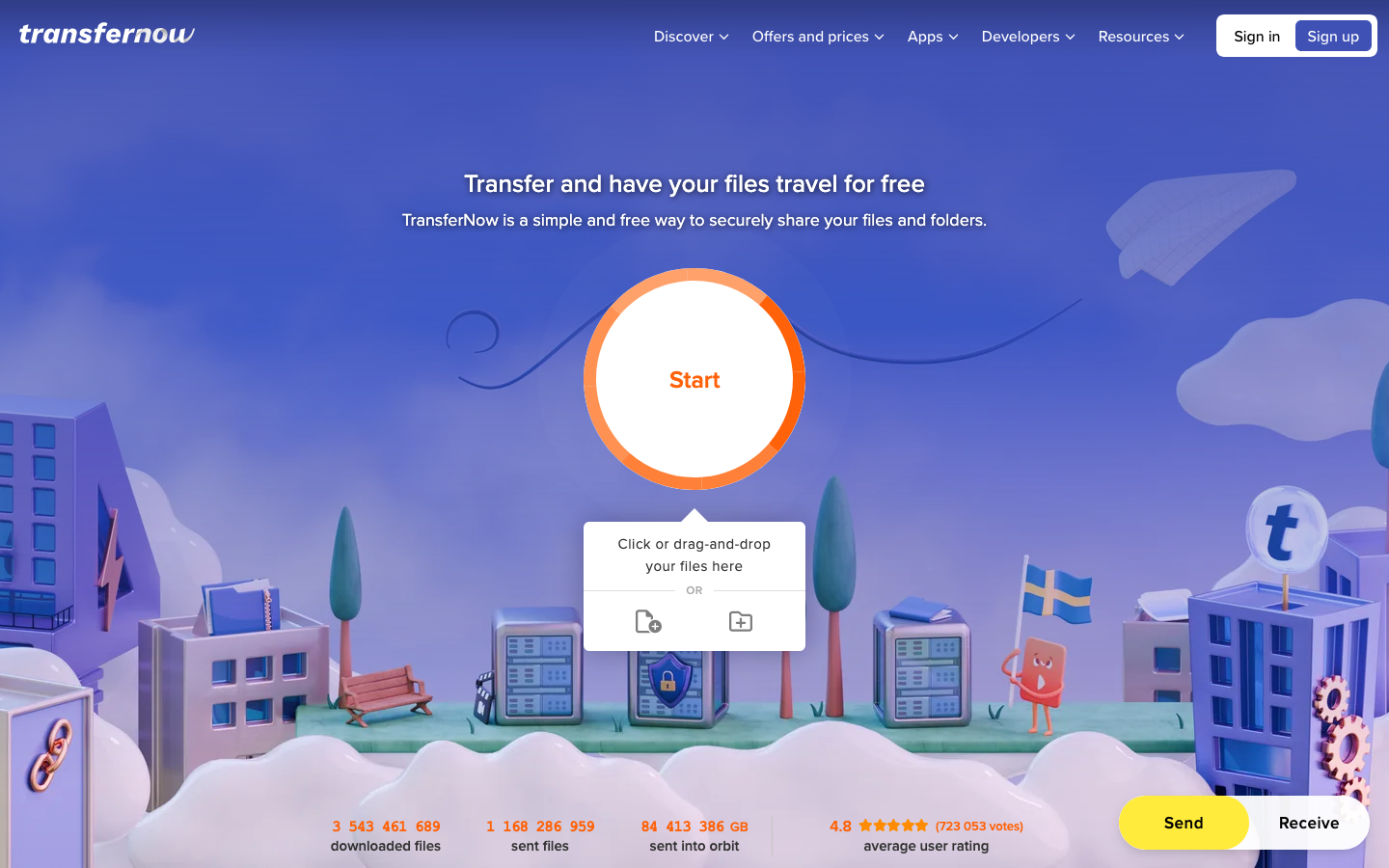A screenshot of the TransferNow landing page. It looks kinda cool but cluttered in our opinion.
